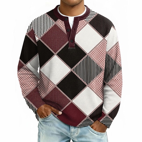 Herren Geometrisch Karomuster Farbblock Waffel-Henley-Hemd Lässiger Stil Klassicher Stil Langarm Mode Designer Grafik Lässig Täglich Outdoor Herbst Frühling Herbst Grau Dunkel Blau Wein Kaki Henley