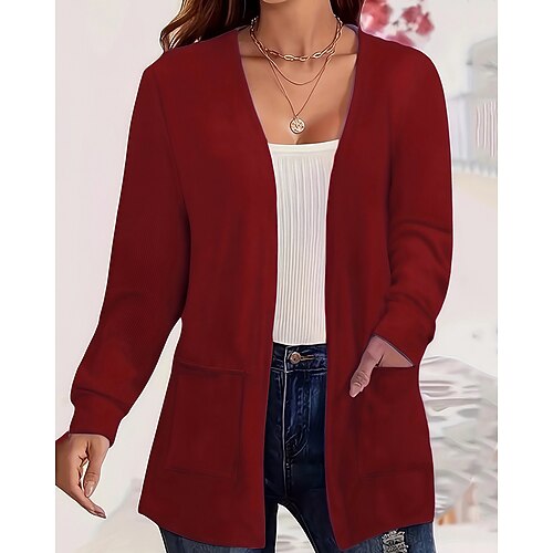 Damen Pullover Strickjacke Mode Streetwear Lässig Einfarbig Gerippt Öffnung vorne Tasche Gestrickt Langarm Lange Oberteile Stricken Outdoor Täglich Wochenende Weinrot Schwarz Herbst Winter
