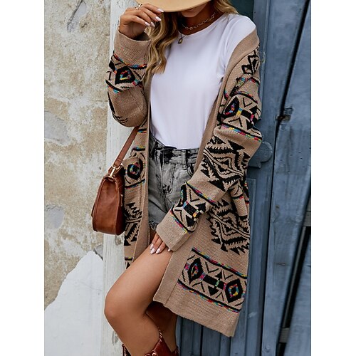 Damen Strickjacke Cool Stilvoll Vintage-Stil Geometrisch Gestreift Hemdkragen Tasche Langarm Lange Oberteile Stricken Outdoor Grün Herbst Winter