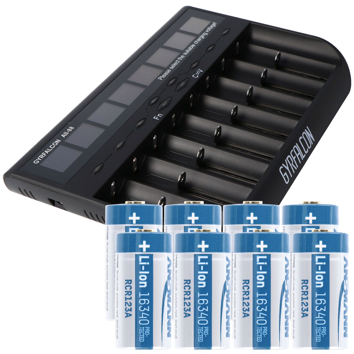 AccuCell 8fach Schnell-Ladegerät und 8 Stück CR123 A Li-Ion Akku mit 3,6V, 3,7 Volt, 850mAh