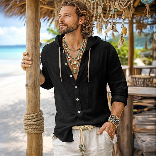 Per uomo Camicia Camicia di lino Abbigliamento da spiaggia Camicia con Bottoni Camicia con cappuccio Semplice Casuale Quotidiano Nero Bianco Cachi Verde militare Manica Lunga Con Cappuccio Estate