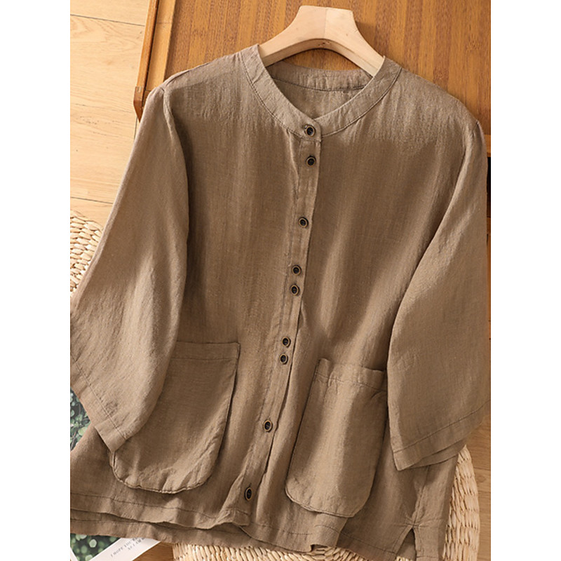 Women's Cotton Linen Shirts Solid Color Basic Casual 3/4 Length Sleeve Crew Neck Regular Tops Daily Pocket Buttons White Wine Green Khaki Summer Spring Fall