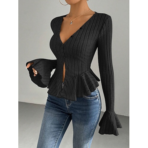 Per donna Blusa Tinta unica Elegante Casual Manica Lunga Scollo a V Top Regolari Quotidiano Volant Bottoni Blu Nero Rosa Vino Grigio Primavera Autunno Inverno