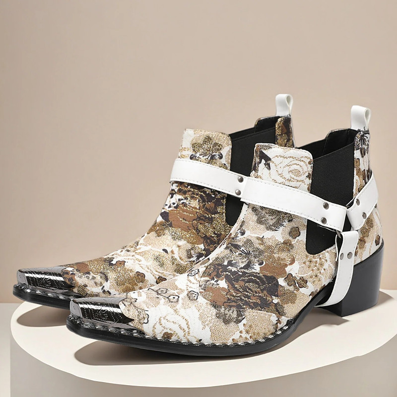 Men's Floral Print White Leather Ankle Boots - Fashionable Buckle Detail with Bold Floral Design, Perfect for Street Style and Casual Events