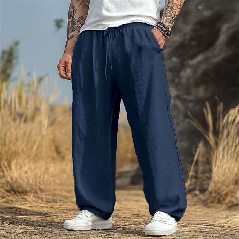 Men's Linen Pants Trousers Summer Pants Baggy Pants Beach Pants Drawstring Elastic Waist Straight Leg Plain Comfort Breathable Full Length Home Yoga Holiday Vacation Fashion Black White Inelastic