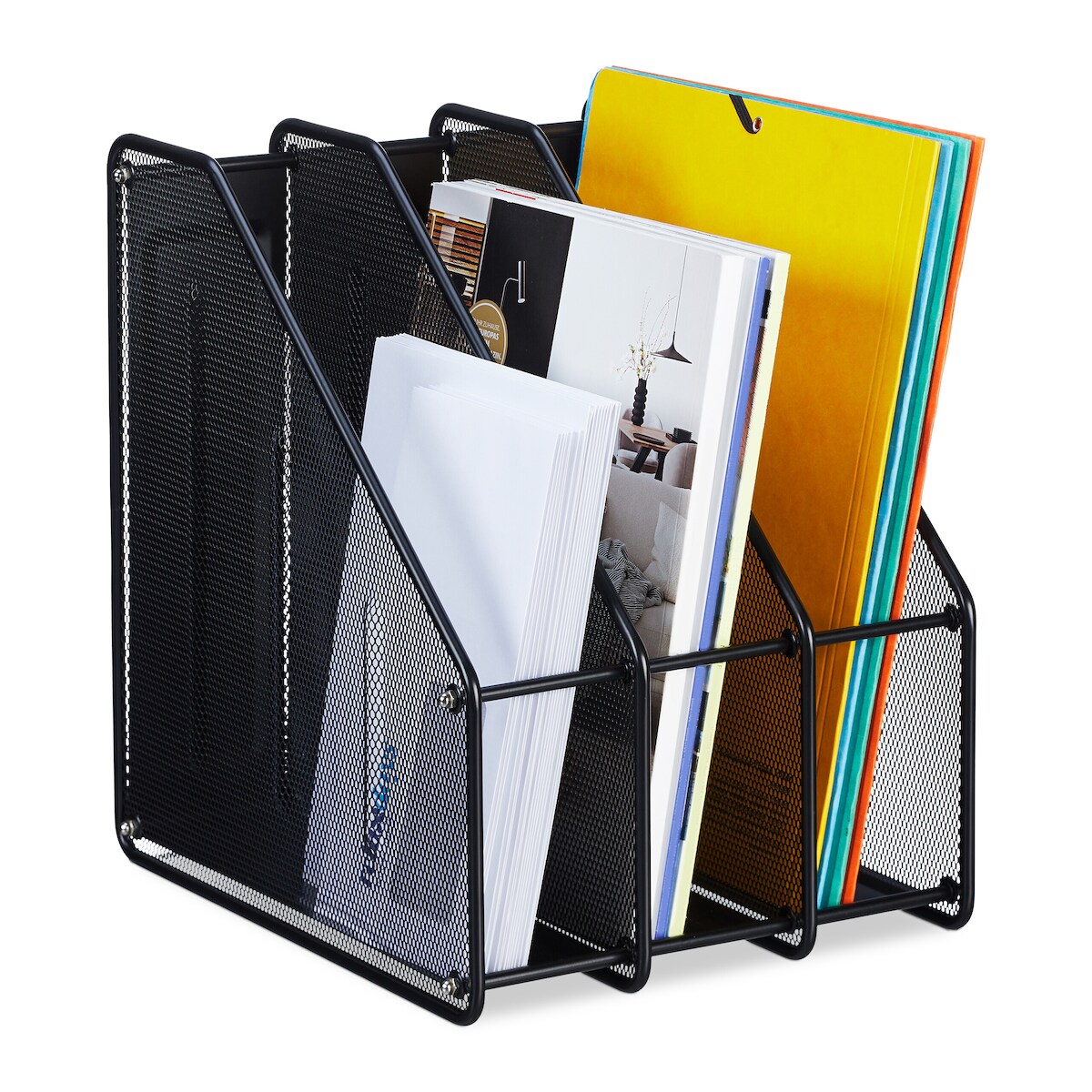 Relaxdays Stehsammler, A4, 3 Fächer, Mesh-Design, HBT: 31,5x24x29 cm, Büro & Home-Office, Stehordner, Metall, schwarz