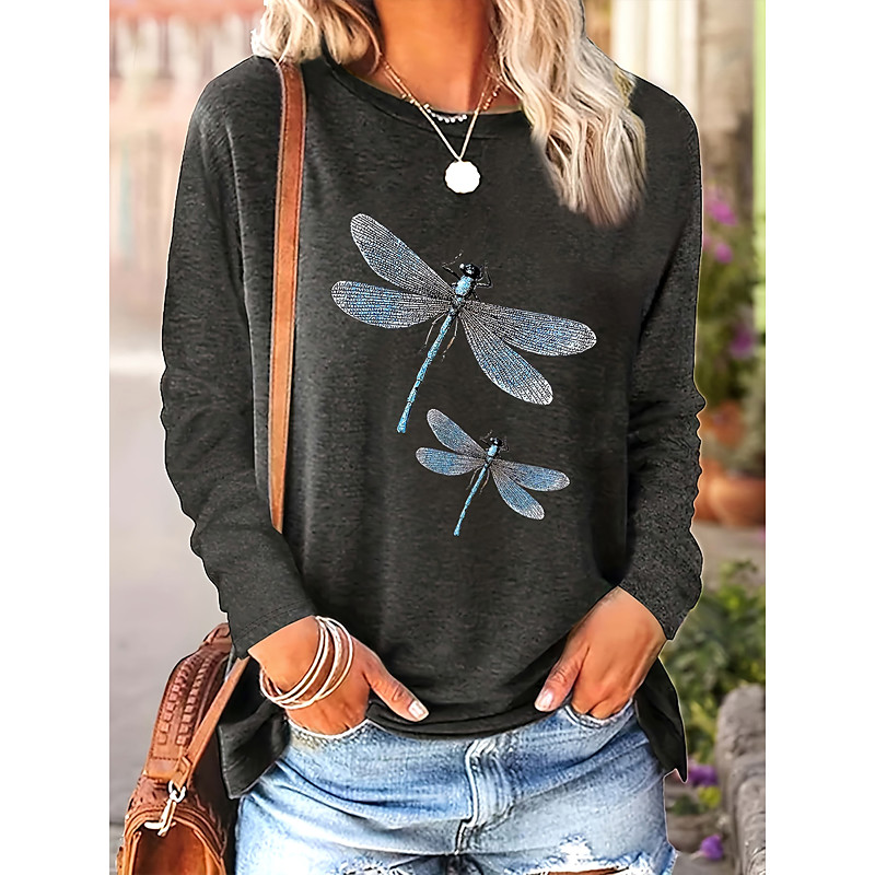 Women's T Shirt Graphic Animal Dragonfly Vintage Stylish Classic Long Sleeve Crew Neck Round Neck Regular Tops Daily Print Black Navy Blue Light Blue Spring Fall Winter