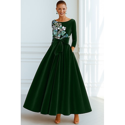 Linea ad A Lunghezza al pavimento Perline ricamate Abito Formale Abito da madre della sposa Abito da Sera Da principessa Abito formale Elegante Vintage Manica 3/4 Girocollo Matrimonio Formale Tasca