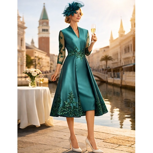 Linea ad A Lunghezza Tè Vestito da Festa Abito da Cocktail Abito da invitata a nozze Abito da cerimonia per signora Manica 3/4 Scollo a V Elegante Ospite di nozze Raso con Fascia / Nastro
