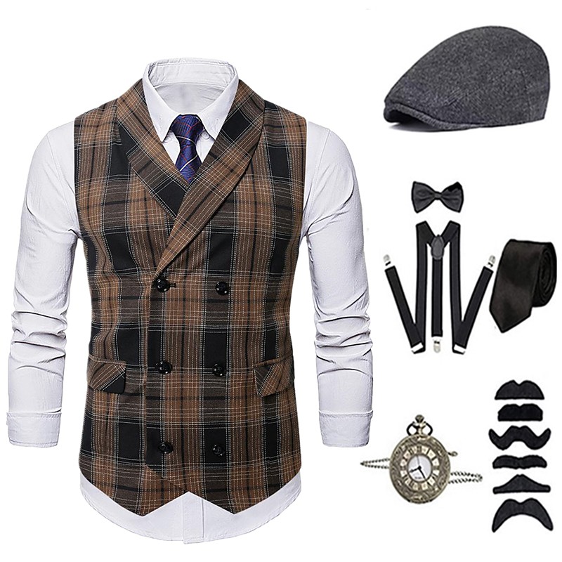 1920s Vintage Inspired The Great Gatsby Party Costume Accessories Set Sleeveless Double Breasted Plaid Turndown Fancy Dress Men's Halloween Party Evening Casual Daily Adults' Vest Hat All Seasons