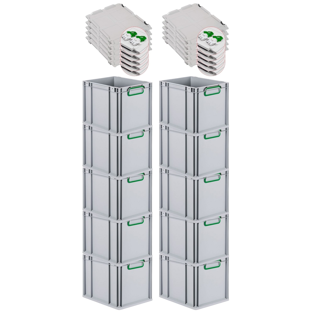 PROREGAL 10x Eurobox NextGen Color mit Scharnierdeckel & Verschlüssen | HxBxT 22x30x40cm | 30 Liter | Griffe grün geschlossen | Glatter Boden