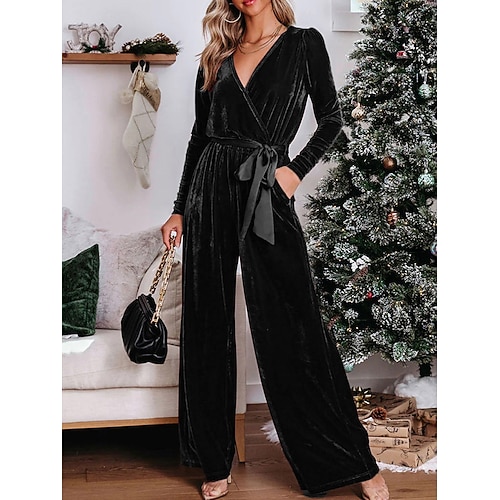 Per donna Normale Tuta Elegante Tinta unica Manica Lunga Scollo a V profondo Con Cintura Vacanza Feste Vestibilità regolare Nero Rosso Blu Primavera