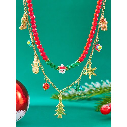 set di collane di perline natalizie da donna: perline rosse e verdi con ciondoli a forma di Babbo Natale, pupazzo di neve e albero, perfetti per feste e celebrazioni festive