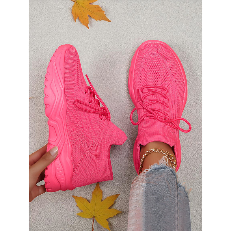 Women's Red Flyknit Chunky Sole Sneakers – Breathable Lace-Up Sports Shoes for Casual Streetwear and Gym Training