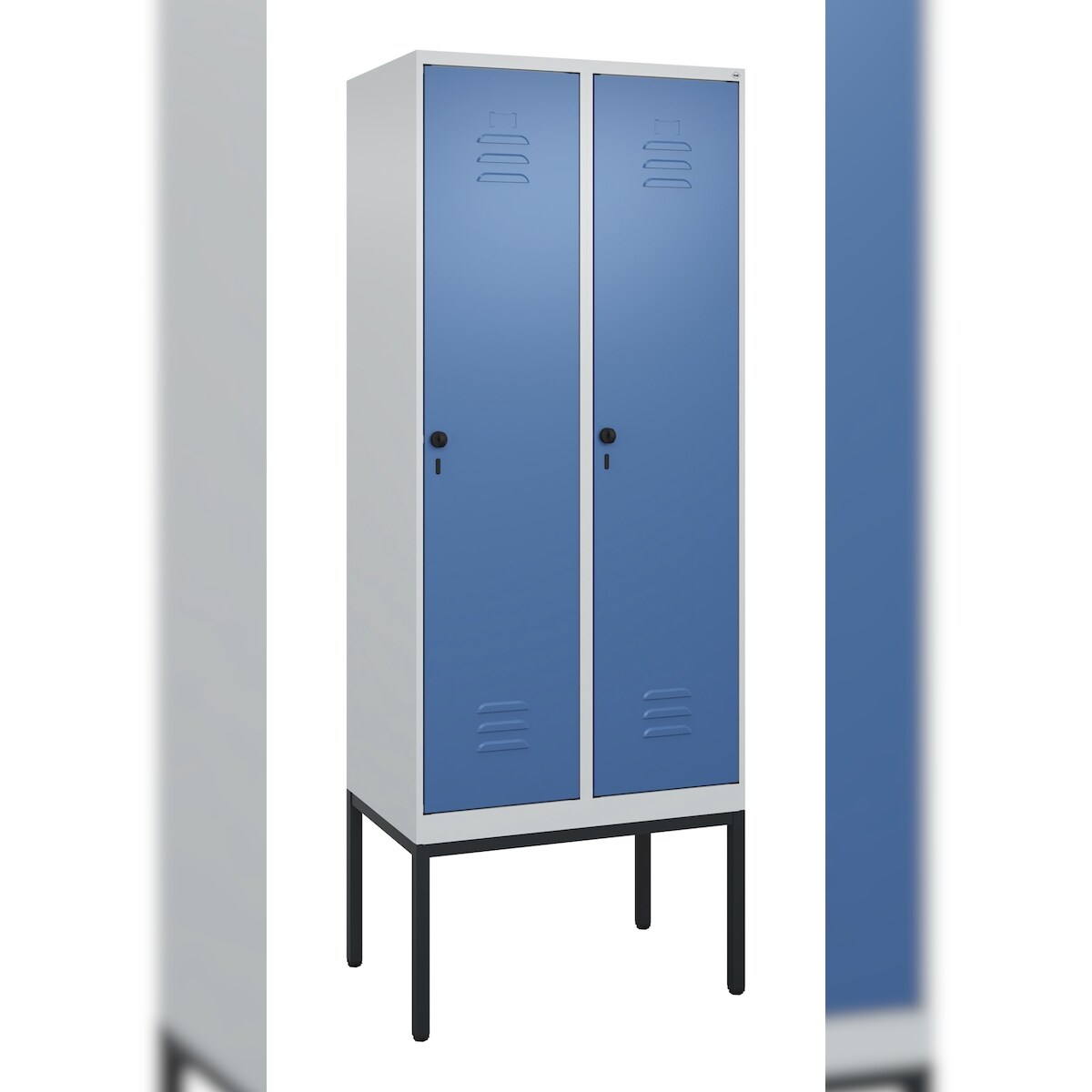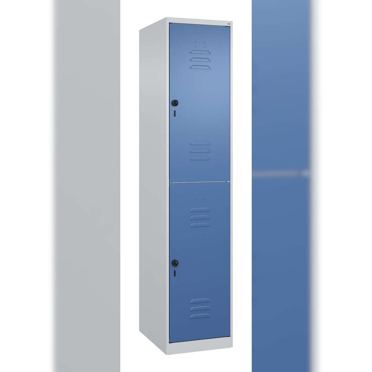 Spind Evolo PLUS, 2 Abteile, lichtgrau / enzianblau, B 800 mm, mit Bodensockel, Drehriegel C+P
