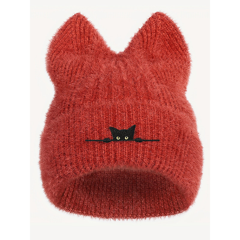 Women's Fuzzy Knit Cat Ear Beanie Hat, Cute Winter Warm Cap with Black Cat Embroidery, Stylish Christmas Gift for Girls Women