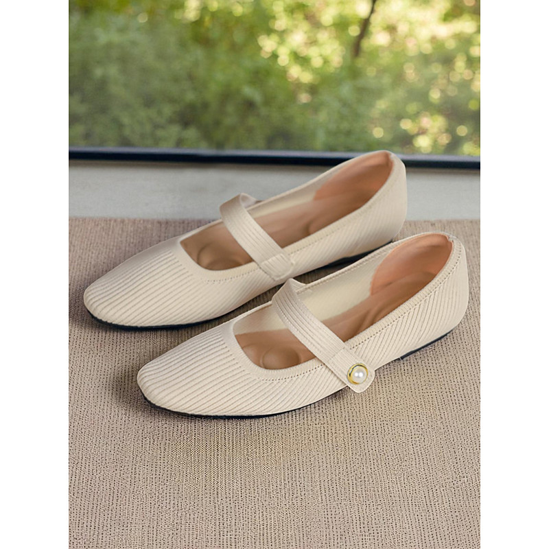 Women's Beige Knit Mary Jane Flats with Pearl Strap - Lightweight Breathable Casual Shoes for Daily Wear,Travel and Office Outfits