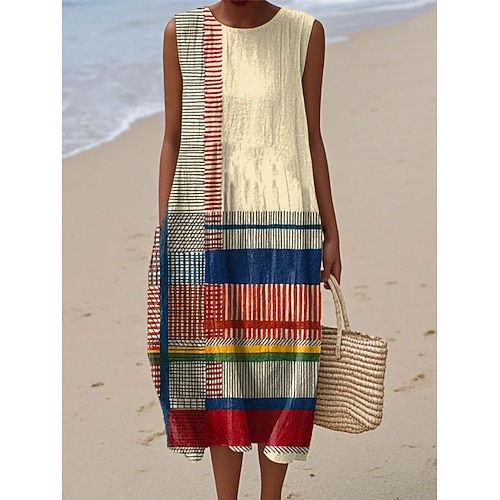 Per donna Abito Midi Vestito Estivo Abito a Tubino Abito a trapezio Vacanza Casual Boho Uscire Spiaggia Vestibilità comoda Grafico Geometrico Senza Maniche Girocollo Grigio verde Nero Rosa Cachi