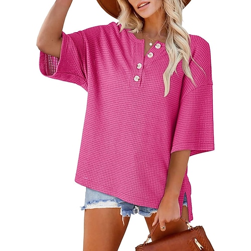 Per donna Maglietta Tinta unica Moderno Casual Manica Corta Scollo a V Top Regolari Quotidiano Uscire Weekend Bottoni Nero Bianco Rosa Rosa polverosa Grigio Estate Primavera