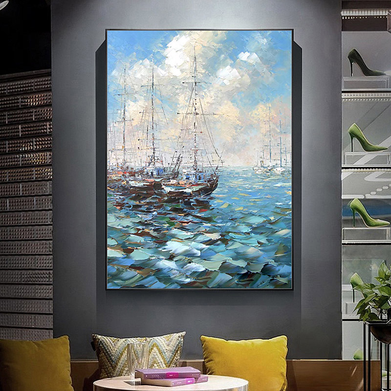 Handmade Oil Painting Canvas Wall Art Decoration Modern Abstract Boating Small Boat for Home Decor Stretched Frame Hanging Painting/Rolled Canvas (No Frame)