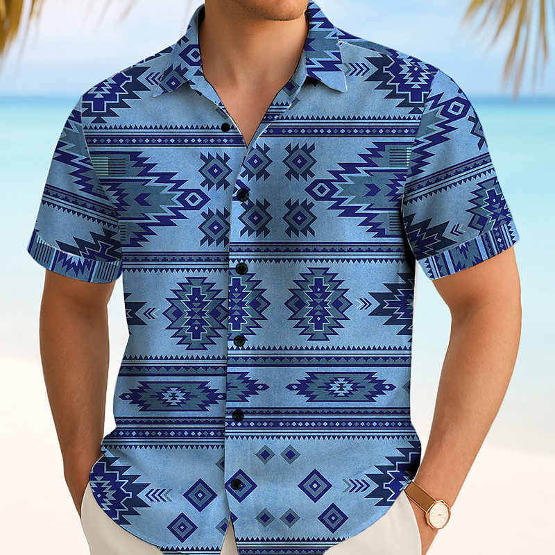 Men's Aztec Ethnic Indian Culture Shirt Summer Shirt Button Up Shirt Short Sleeve Vintage Retro Outdoor Vacation Dailywear Summer Spring Turndown 3D Print Collared Shirts Blue Green Khaki