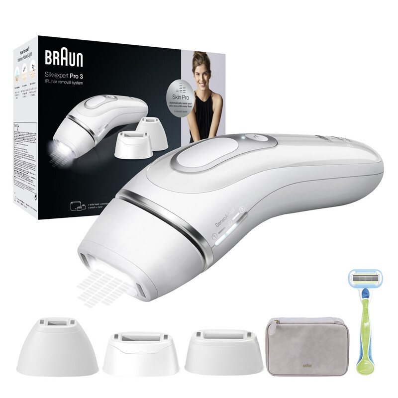 Braun Silk·expert Pro 3 PL3233 Women’s IPL, At Home Hair Removal Device with Pouch and 3 attachments, White/Silver