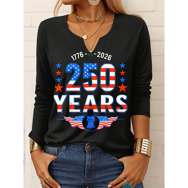 American 250th Women's Independence Day T Shirt Graphic Flag Vintage Stylish Modern Long Sleeve Notched Neck Regular Tops Daily Weekend Print Blue Black Khaki Spring Winter