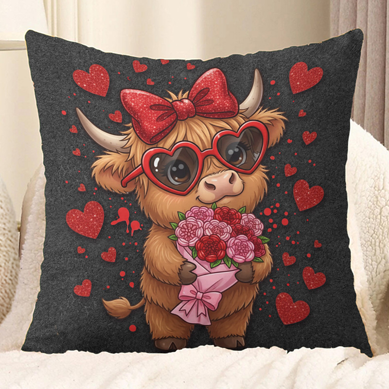 Valentine's Day 2D Flat Print Dark Pillow Cover, Cow with Pink Heart Glasses, Holding Roses Hearts, Waving Design, Cute Valentine's Day Decorative Cushion Case