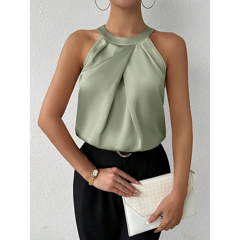Women's Satin Shirt Camp Collar Shirt Solid Color Stylish Basic Casual Sleeveless Halter Neck Regular Tops Daily Holiday Going out Ruched Black White Champagne Wine Green Summer Spring