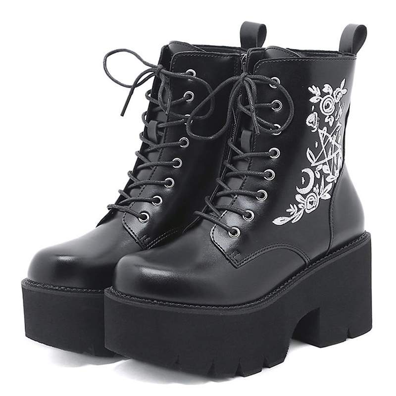 Women's Black Chunky Halloween Lace-Up Platform Boots with Butterfly Embroidery - Goth Streetwear Ankle Boots for Spooky Party and Daily Edgy Outfits