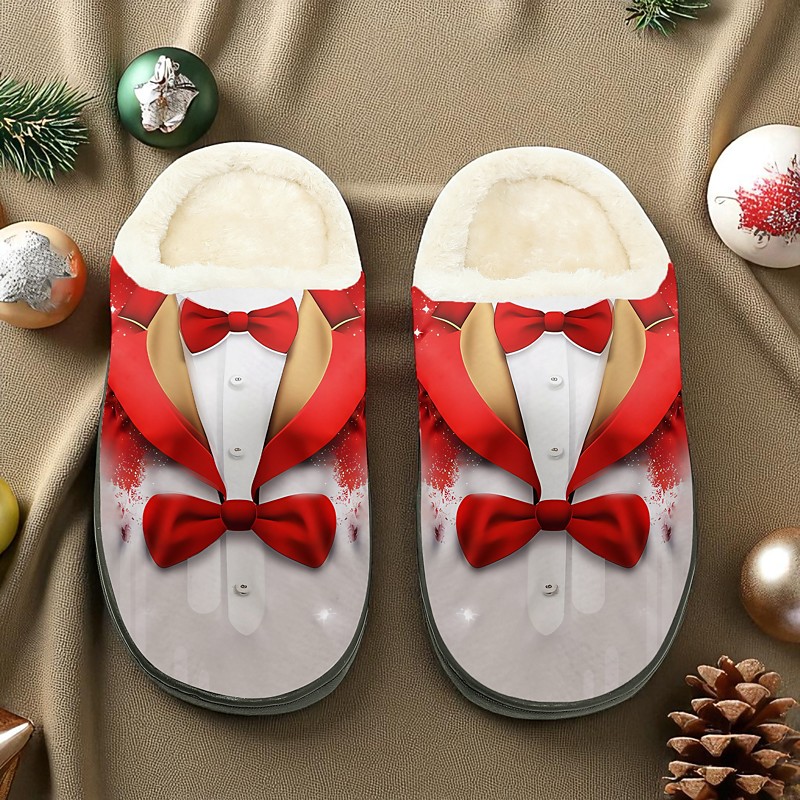 Men's Christmas Suit Slippers - Festive Red Bow Tie Design Warm Fleece Indoor Shoes, Cozy Holiday Home Footwear for Winter and Christmas Gifts