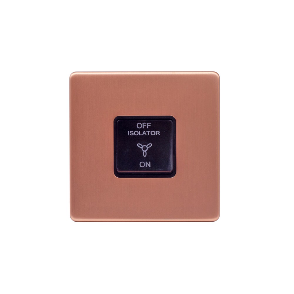 Lieber Brushed Copper 10A 1 Gang 1 Way 3-Pole Extractor Fan Isolator Switch - Black Insert Screwless - Size: 86mm x 86mm x 2 mm