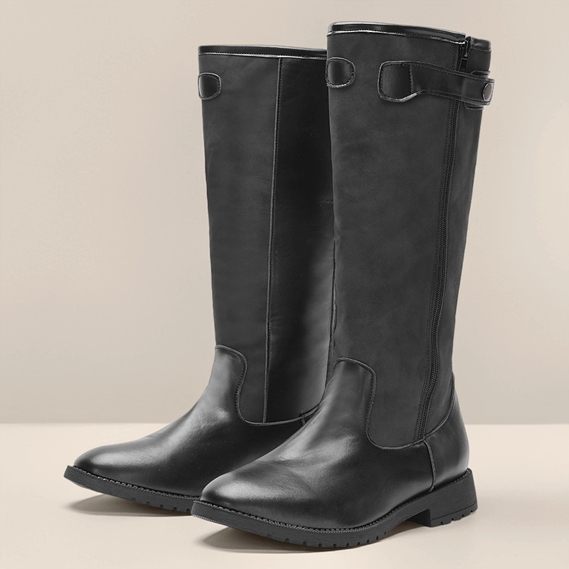 Women's Black Faux Leather Knee-High Slouch Boots – Side Zip and Buckle Strap Detail, Riding Fall Fashion