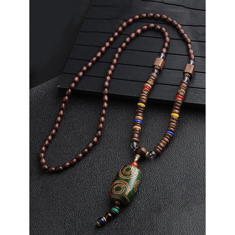 Men's Tribal Beaded Pendant Necklace – Handmade Ethnic Wooden Beads with Turquoise Accents, Bohemian Style for Casual Wear, Yoga, Meditation or Festival Outfits