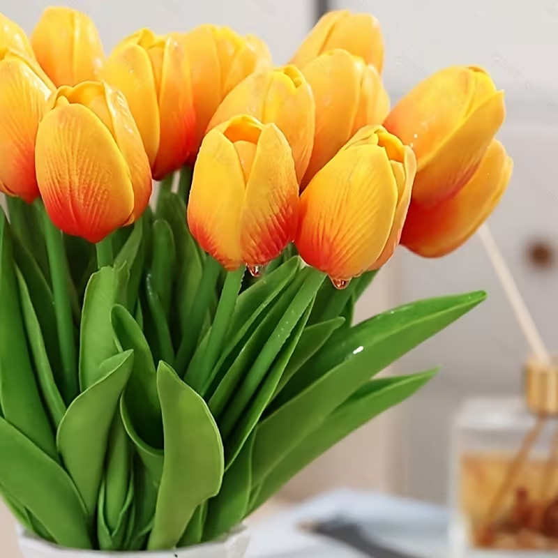 22pcs Artificial Realistic Tulip Bouquet - Pink and White Faux Tulips with Green Stems Resin/Plastic Flowers for Wedding Home and Office Decoration - Realistic Table Centerpiece Low Maintenance