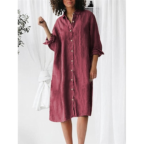 Abito da donna in cotone e lino, per la casa, quotidiano, da letto, manica lunga, con revers, colore: verde militare, blu navy, estate, primavera