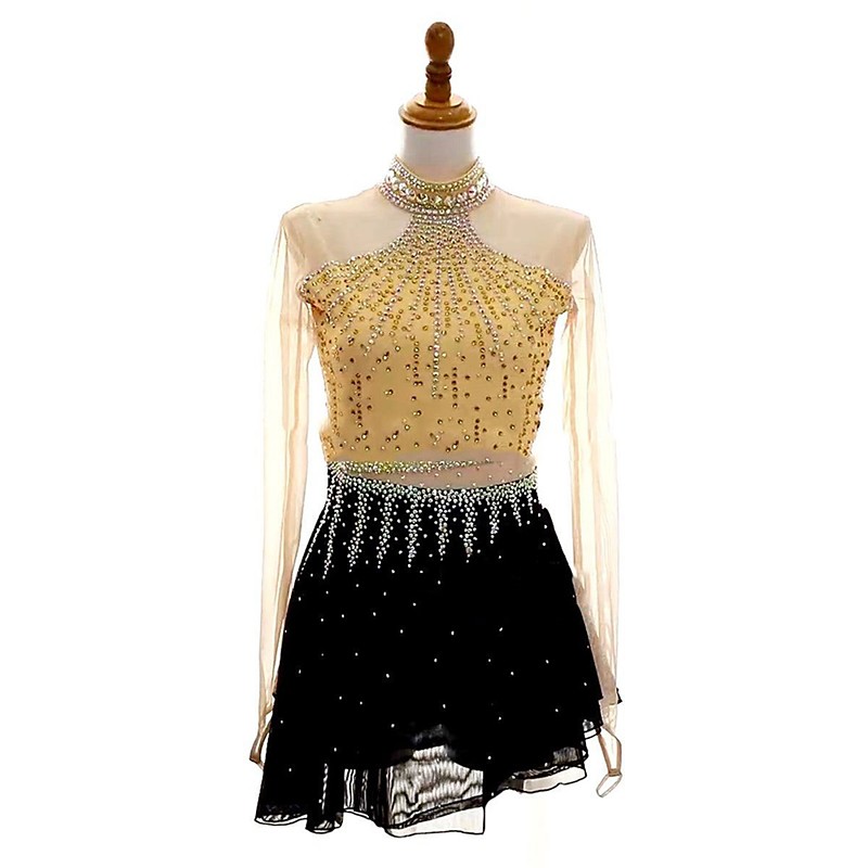 Figure Skating Dress Women's Girls' Ice Skating Dress Black Golden Patchwork Thumbhole Mesh Spandex Stretchy Training Practice Professional Skating Wear Crystal / Rhinestone Long Sleeve Figure Skating
