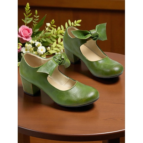 Scarpe mary jane da donna vintage anni '50 in similpelle verde con fiocco - elegante stile retrò, perfette per eventi vittoriani ed edoardiani e riunioni formali