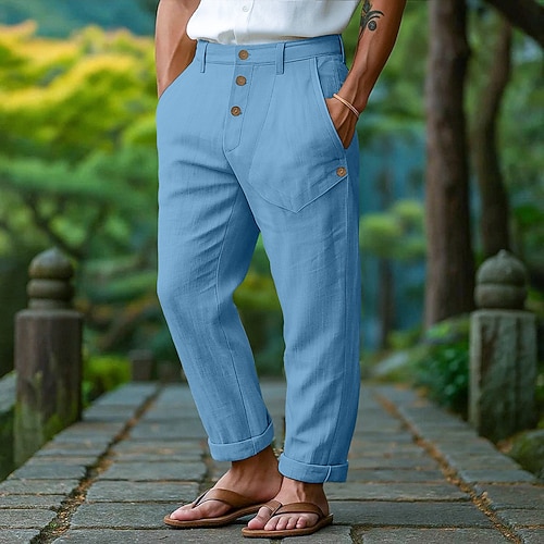 Per uomo Pantaloni di Lino Pantaloni Pantaloni Estivi Tasca Frontale Gamba Dritta Semplice Comodità Traspirante Lunghezza intera All'aperto Casuale Quotidiano Vacanza Moda Bianco Blu Inelastico