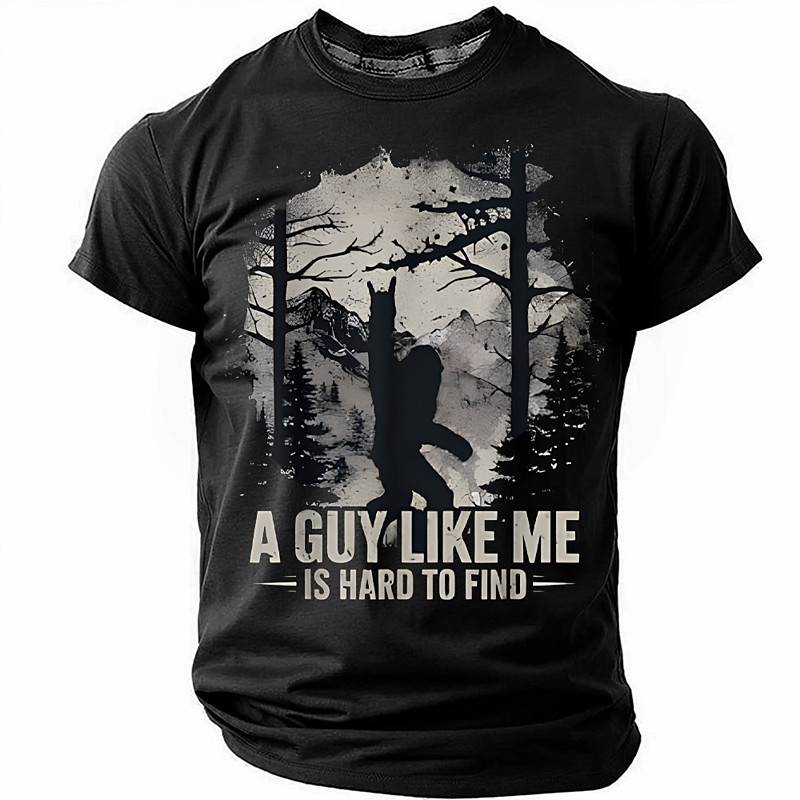 Bigfoot Funny T-shirt, A Guy Like Me Is Hard to Find Sasquatch Tee, Forest Silhouette Mountain Design, Humorous Cryptid Shirt for Men, Outdoor Hiking Gift Apparel, Sizes S M L XL XXL XXXL