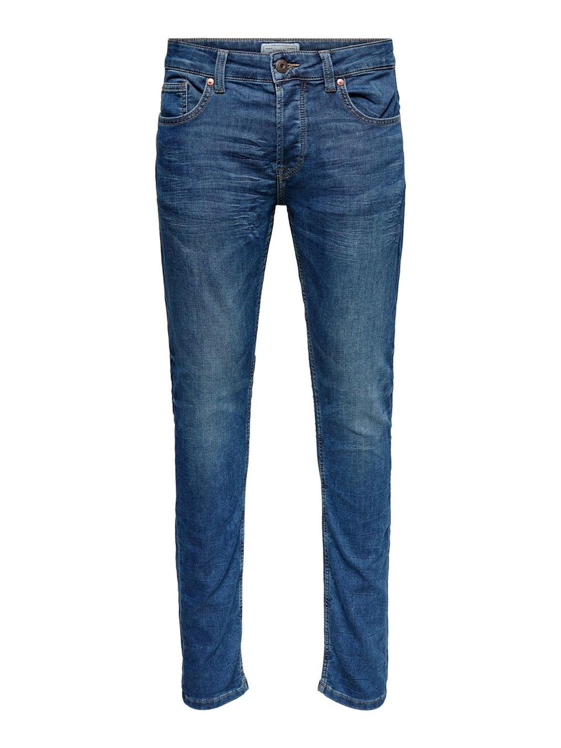Slim-fit-Jeans ONLY & SONS "OS ONSLOOM SLIM BLUE GREY 40", Herren, Gr. 34, Länge 32, blau (dunkelblau denim), Denim/Jeans, Obermaterial: 95% Baumwolle, 3% Elastomultiester, 2% Elasthan, Abriebeffekte, slim fit, Jeans Slim-fit-Jeans, mit Destroyed Effekt d