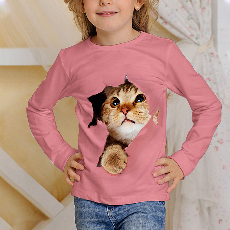 Girls' 3D Cat T shirt Tee Long Sleeve Spring Fall Fashion Basic Kids 4-12 Years Crew Neck Outdoor Casual Daily Regular Fit