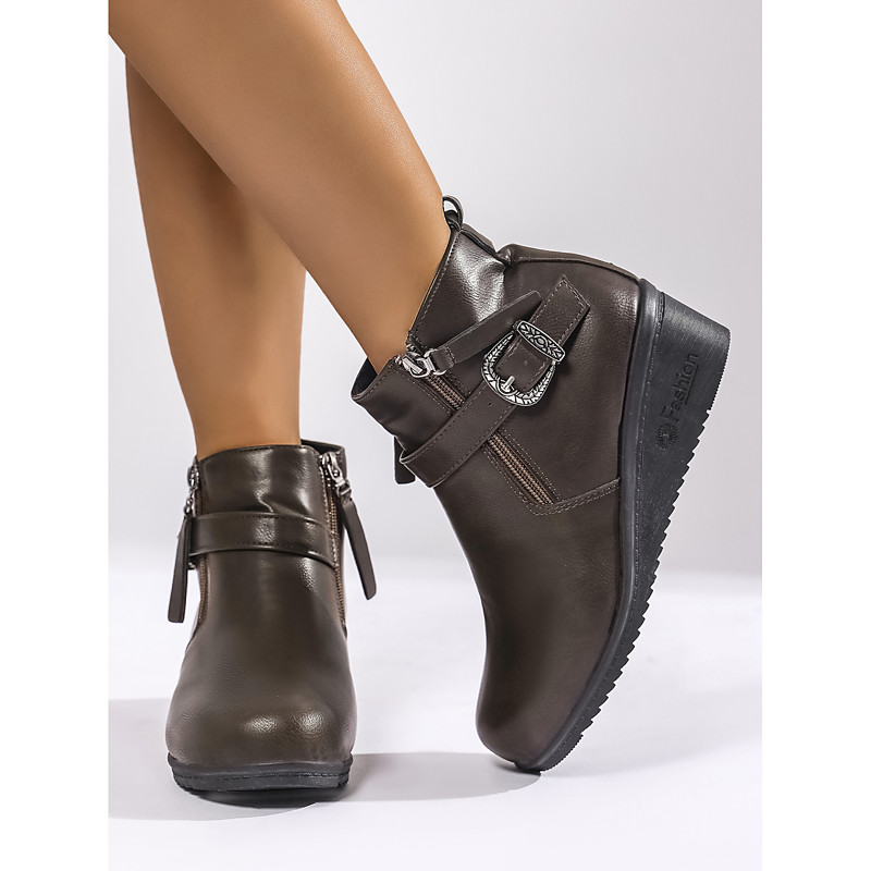 Women's Brown Faux Leather Wedge Ankle Boots – Side Zipper Booties with Buckle Strap, Comfortable Non-Slip Casual Winter Shoes