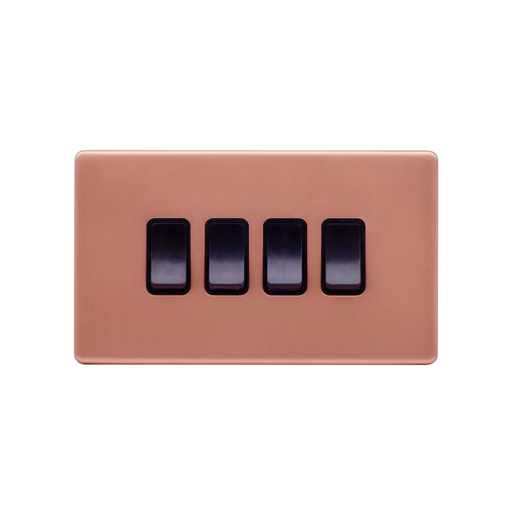 Lieber Brushed Copper 10A 4 Gang 2 Way Switch - Black Insert Screwless - Size: 146mm x 86mm x 2 mm