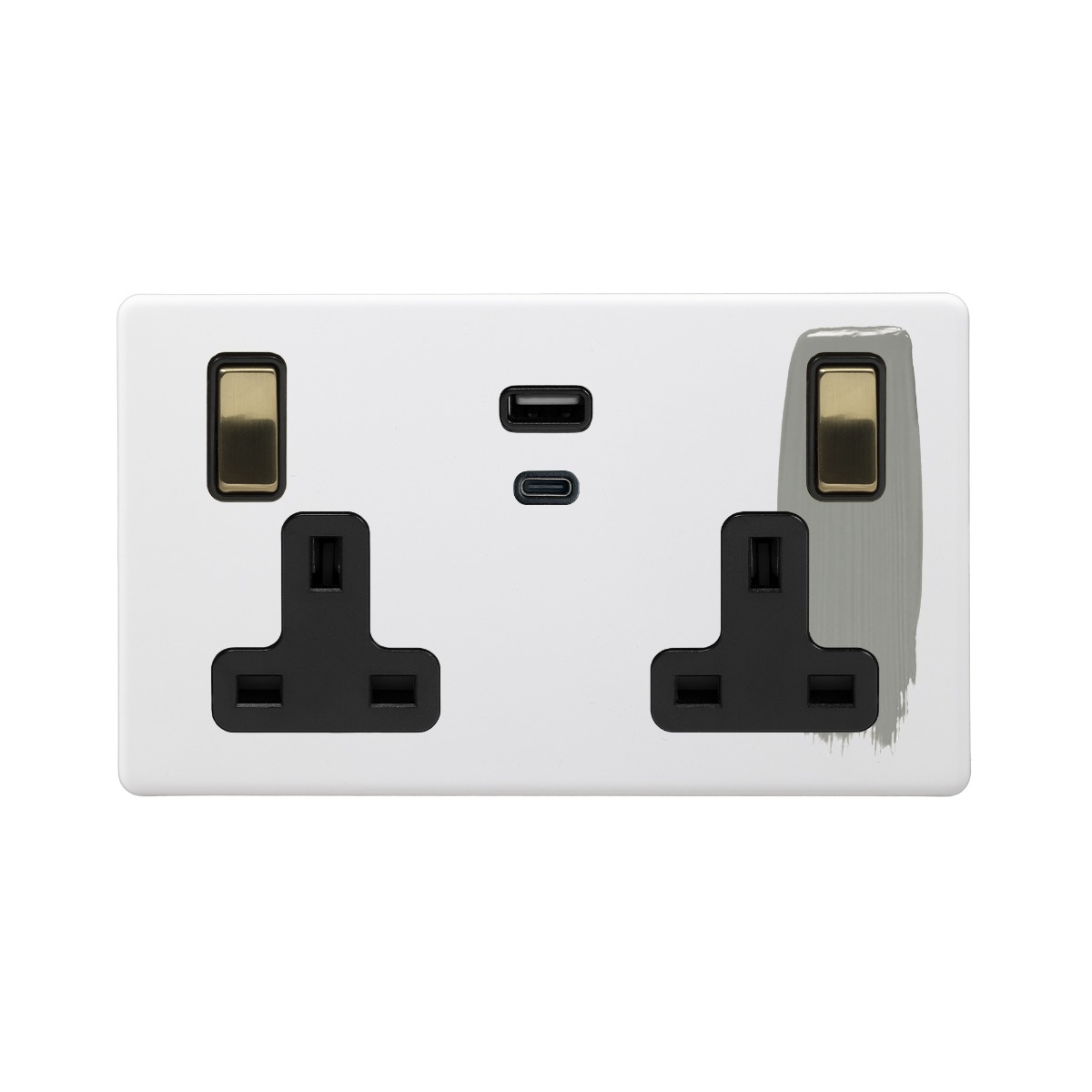 Soho Lighting Primed Paintable 13A 2 Gang Super Fast Charge 45W USB A+C Socket with Brushed Brass Switch with Black Insert