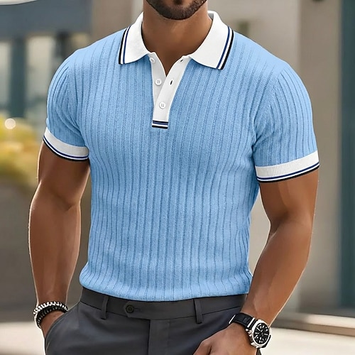 Per uomo Testurizzato Maglia da golf Casuale Lavoro Bavero Colletto Polo a Coste Manica Corta Essenziale Moderno Blocco di colori Patchwork Bottoni Primavera Estate Vestibilità aderente Blu Bianco