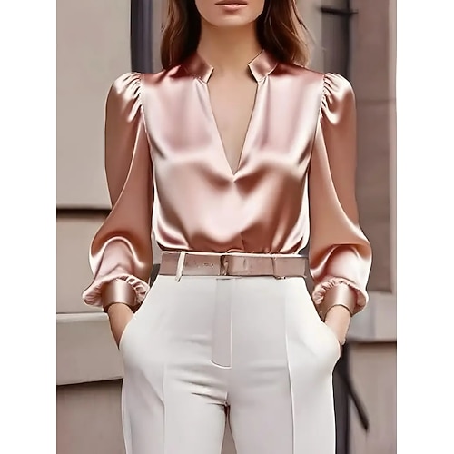camicetta da donna in raso tinta unita elegante casual manica lunga scollo a V top normali ufficio lavoro nero bianco rosa primavera autunno