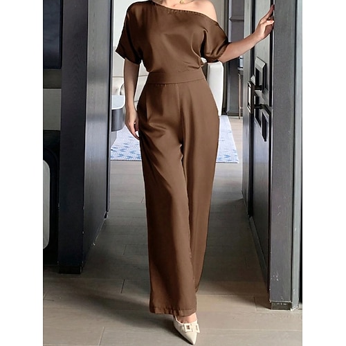 Per donna Normale Tuta Elegante Tinta unica Manica Corta Gamba larga Senza Spalle Patchwork Tasca Quotidiano Casa Vestibilità regolare Vino Marrone Verde Estate