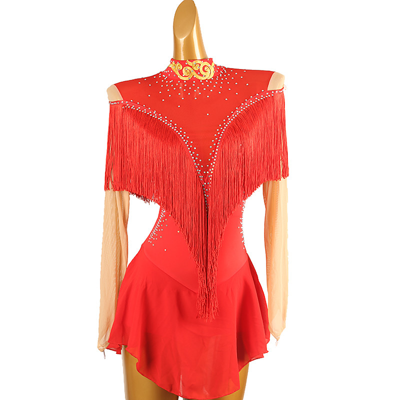 Figure Skating Dress Women's Girls' Ice Skating Dress Red Patchwork Open Back Mesh High Elasticity Training Competition Skating Wear Classic Crystal / Rhinestone Long Sleeve Ice Skating Figure Skating