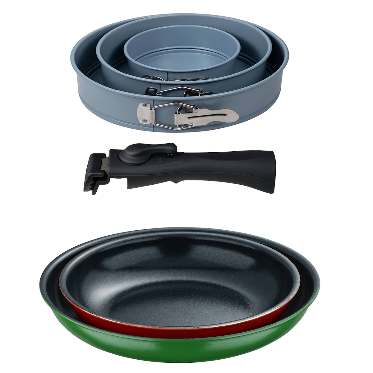 BERGNER - Set aus 2 Pfannen Ø22/26 cm gepresstes Aluminium mit abnehmbarem Griff mit Set aus 3 runden Backformen Ø12/Ø18/Ø22cm